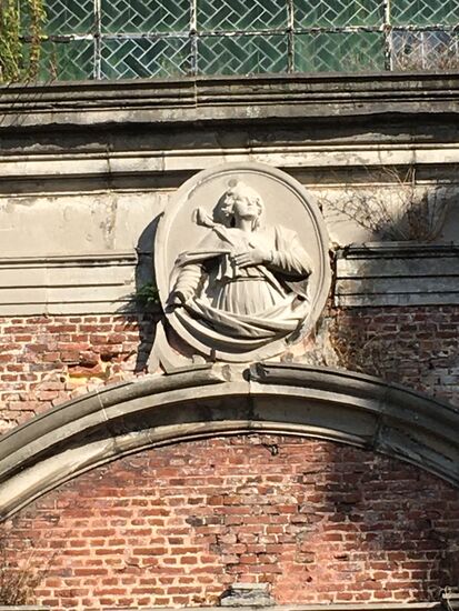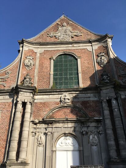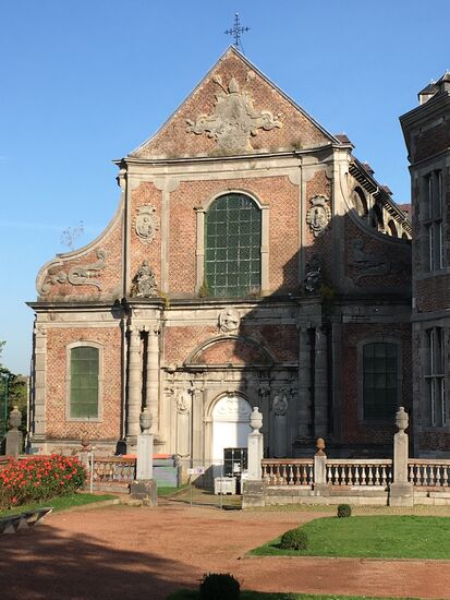 Die Weihe des Langhauses ist für das Jahr 1250 bezeugt, doch sind seine gotischen Formen großenteils unter einer barock-klassizistischen Fassade verschwunden, das betrifft vor allem die Stirnseite aus Ziegeln und Kalkstein. Leicht eingeschwungen, teilt sie ein kräftiges Sims in zwei Geschosse. Das Portal flankieren zwei Ringsäulenpaare mit ionischen Kapitellen und einem hohen Sockel. Darüber schwingt das Mauerwerk nach beiden Seiten weit aus und sein Werksteinrahmen rollt sich oberhalb des Gebälks zur Volute ein. Die Vertikale betonen dagegen die gerahmten langgestreckten Felder als Fortsetzungen der Säulen unter ihnen. Sie fassen ein schlichtes Rundbogenfenster ein, wie überhaupt dieses zweite Geschoß die dezenteren, eben klassizistischen Formen zeigt. Der Giebel, während des 19. Jh. einigermaßen lieblos restauriert, präsentiert das Wappen des damaligen Bauherrn, des Abts Charles Darteville (1737-56).