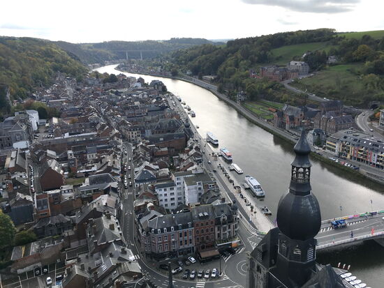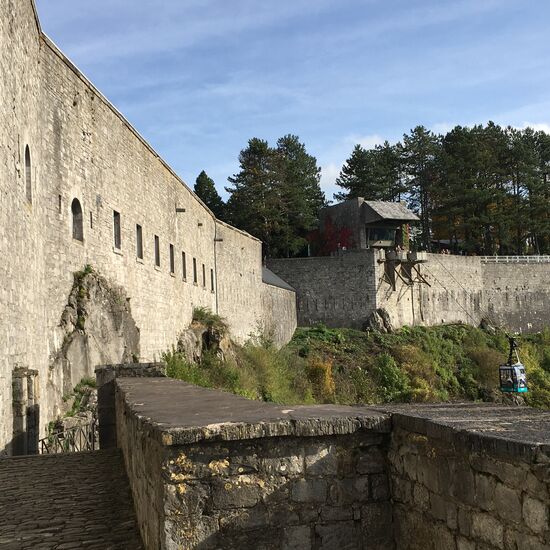 Neben 408 Treppenstufen führt auch eine Seilbahn auf das etwa 100 m höher liegende Felsplateau hinauf. Der Blick über das Maastal und die steil hinab auf die Stadt ist fantastisch. (für den der auch den Eintritt zur Zitadelle zahlt!)