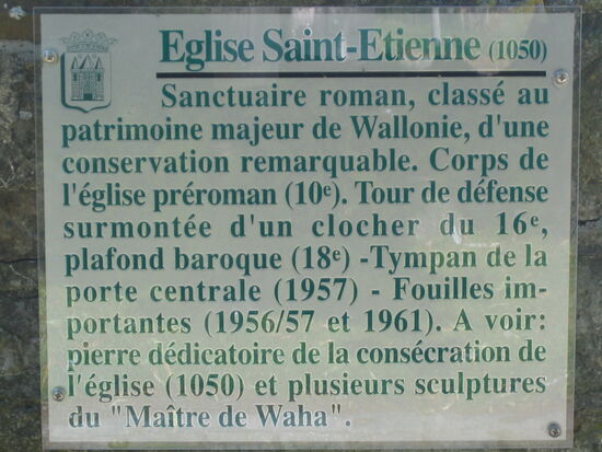 Die Kirche St. Etienne zählt zu den ältesten romanischen Kirchen Belgiens und ist die einzige deren Widmungsstein erhalten geblieben ist. Das Kirchenschiff ist nurvier Bögen lang. Der Chor hat eine rechteckige Form und ist unvaulted. Es ist auch niedriger als die Kirchendecke, was in der frühen Mosan-Architektur nicht ungewöhnlich ist. Der Westwerkturm ist etwas jünger als der Rest der Kirche.