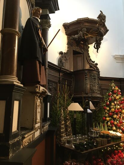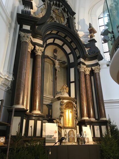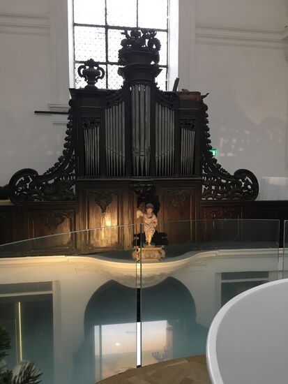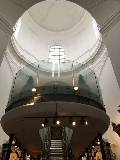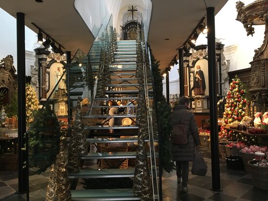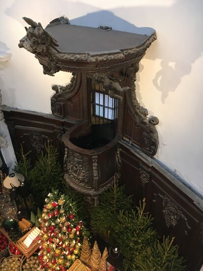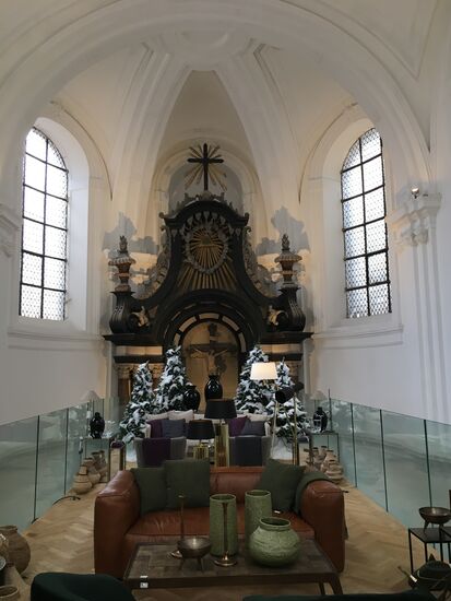 Im Herbst 2019 kann man die - zwischenzeitlich wohl entweihte - Kirche innen besichtigen, da sich eine Verkaufsausstellung etabliert hat, mit einer gläsernen Empore, die frei in den Innenraumnmder Kirche eingebaut wurde.