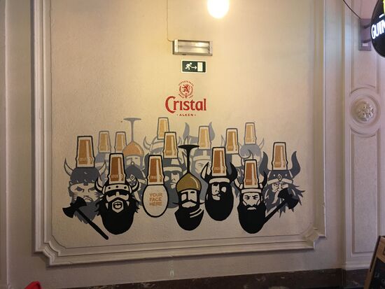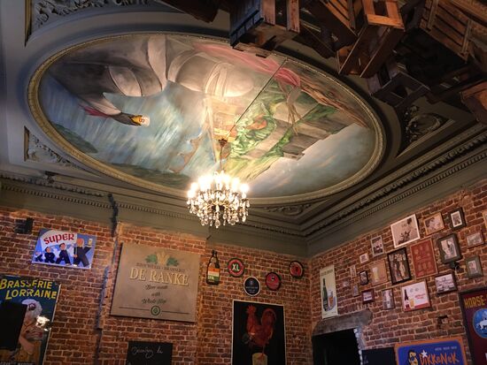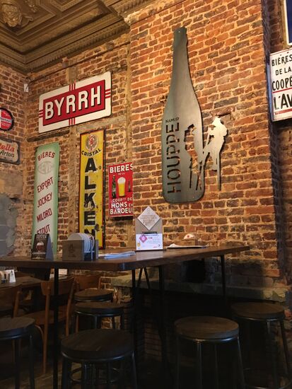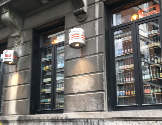 und wählen ebendort ein Lokal für überweigend junge Leute, das uns auffällt durch die Dekoration außen wie innen mit hunderten belgischer Biersorten.