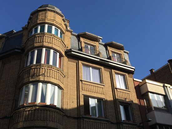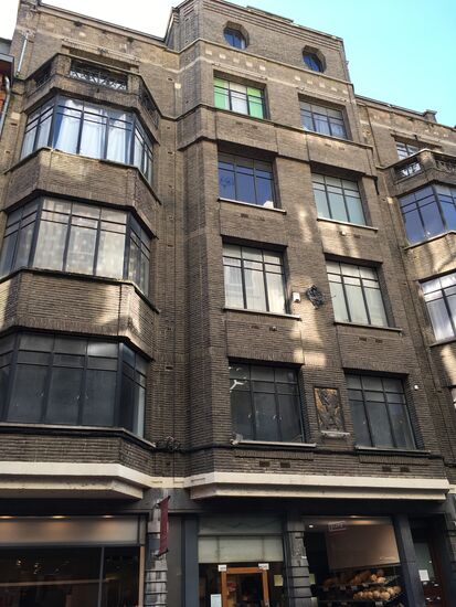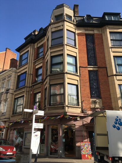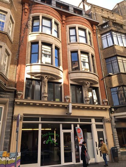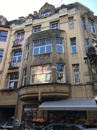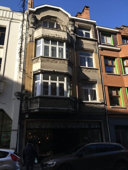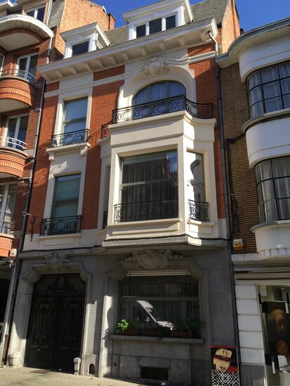 particulièrement soigné et luxueux, inspiré des hôtels Tassel et Solvay réalisés par Victor Horta. Le bow-window constitue l’élément principal de cette élégante façade en pierre blanche où l’on remarque également les ferronneries (grille d’entrée, balcon) et les prises d’air à l’aspect de gueules de chimères. La