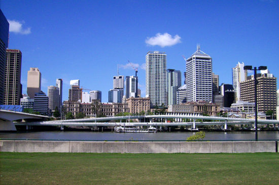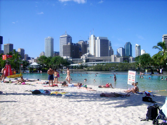 Brisbane war schön, nix besonderes, aber doch sehenswert, australische Großstadt halt... Ein Fluss - der Brisbane River- schlängelt sich durch die Stadt und ist über einige Brücken zu überqueren, wodurch schöne Fotomotive entstehen. Ein Freibad ' - mit künstlich angelegtem Pool - aber eingesäumt von Sand mit vielen Palmen - ist das Australien? Kam mir eher vor wie Karibik oder so... Die Stadt ist generell erstaunlich grün, obwohl Hochsommer, alles frischgrün.