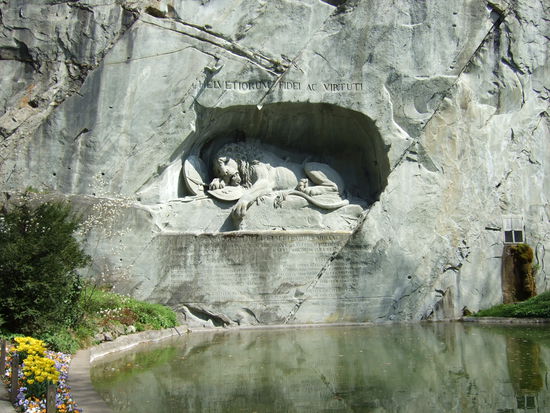 Dafür hat mich das nahe gelegene Löwendenkmal allerdings reichlich entschädigt. Es zählt zu den berühmtesten Denkmälern der Welt und wurde zum Andenken an den Heldentod der Schweizer Söldner errichtet, die im Dienst König Ludwigs XVI. von Frankreich während der Französischen Revolution in Paris beim Tuileriensturm (Das Palais des Tuileries war der Sitz des französischen Königs, nachdem er das Schloss Versailles verlassen hatte.) vom 10. August 1792 gefallen sind oder durch die Guillotine am 2./3. September 1792 hingerichtet wurden. Die Inschrift "Helvetiorum fidei ac virtuti" bedeutet "Der Treue und Tapferkeit der Schweizer". Das Denkmal entstand auf Anregung von Hauptmann Carl Pfyffer von Altishofen, der sich zurzeit des Sturms in Luzern befand und für seine gefallenen Kameraden einen Gedenkort erstellen lassen wollte. Das Löwendenkmal wurde am 10. August 1821 eingeweiht und 1882 ging es durch Kauf in den Besitz der Stadt Luzern über.