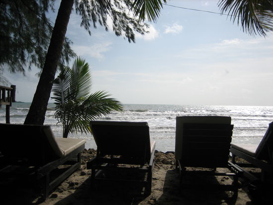 Wir sind nun den 3 Tag auf der Insel Koh Chang. Nach einer Nacht in einer Suite (da das Hotel ueberbucht war), hatten wir eine 6 stuendige und weit ueberteuerte Busfahrt bis nach Trad wo wir eine regnerische Faehrfahrt starteten. Mit einer abenteuerlichen Fahrt in einem Sammeltaxi ging es bis zu unserem Hotel Ramayana, dass doch ein wenig ab vom Schuss lag. Vorallem gibt es auf der Insel weitaus billigere Hotels direkt am Strand, dass uns schon etwas neidisch und auch ein wenig deprimiert machte!