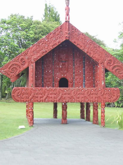 Gegen Mittag kommen wir in Rotorua an, und uns fällt sofort der Schwefelgeruch (Geruch nach faulen Eiern). Zuerst suchen wir unsere erste B&B-Unterkunft. Die Pension wird von einem älteren Ehepaar betrieben und wir haben diese als Empfehlung aus unserem Reiseführer (Baedeker). Der Kitsch pur, aber die Leute sind nett und es ist alles sauber und gepflegt. Danach fahren wir in den Ort, und schauen uns das erste Maori-Dorf(Ohinemutu) am Hafen an. Rotorua ist eine Hochburg für Maori-Kultur und Geschichte. Auch hier kaufen wir unser erstes Souvenir. Dann geht es weiter zum modernen Visitor-Center und danach auch zu Fuß zum Goverment Garden, dem ehemaligen Badehaus, worin sich heute ein Museum befindet. In der ganzen Stadt sind überall Öffnungen aus denen Schwefeldampf steigt.