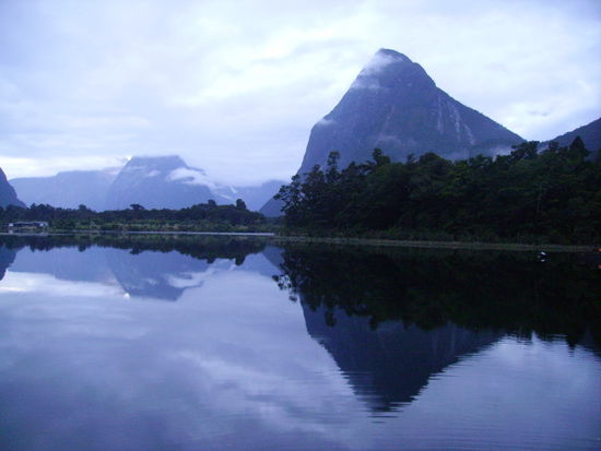 Dann sehen wir den Milford Sound vor uns, und es sieht aus wie auf den Ansichtskarten, mit der Bischofsmütze im Vordergrund.