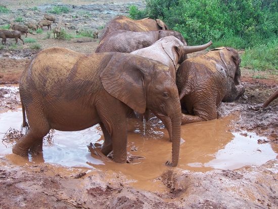 Nach einer Weile konnte ich mich endlich von den "Langhälsen" losreißen und wußte eigentlich nicht recht wohin nun. Das Karen-Blixen-Haus wäre meine Idee gewesen, aber Kevin riet davon ab: Zu teuer und langweilig. Womöglich hatte er recht. Und schließlich hatte ich bereits Karen Blixens Haus in der Nähe Kopenhagens vor einigen Jahren gesehen und das war auch nicht wirklich der Stoff, der einen vom Hocker reißt...Also folgte ich seinem Vorschlag und ließ mich ins David Sheldrick´s elephant orphanage fahren, ein Elefanten-Waisenhaus, in dem die kleinen Elefanten in der Zeit von 11.00-12.00 Uhr besucht werden können. Diese 300 Shilling waren wirklich gut angelegtes Geld, denn damit wird die Stiftung unterhalten und die Elefanten sind einfach goldig, wenngleich hier Streicheln, Füttern und Knutschen nicht angesagt war. Auf jeden Baby-Elefanten kamen bestimmt 10 menschliche Besucher - es war also voll - aber es war einfach wunderschön, die Tiere beim Suhlen im Schlamm und Spielen beobachten zu können - aus nächster Nähe.