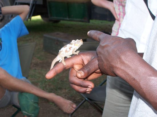 Am späteren Nachmittag im Camp, widmeten wir uns dann dem ersten selbstzubereiteten Abendessen, naja, eigentlich hat unser Koch Georgie fast alles allein gemacht, während wir uns näher beschnupperten und uns mit einem Chamäleon verlustizierten...