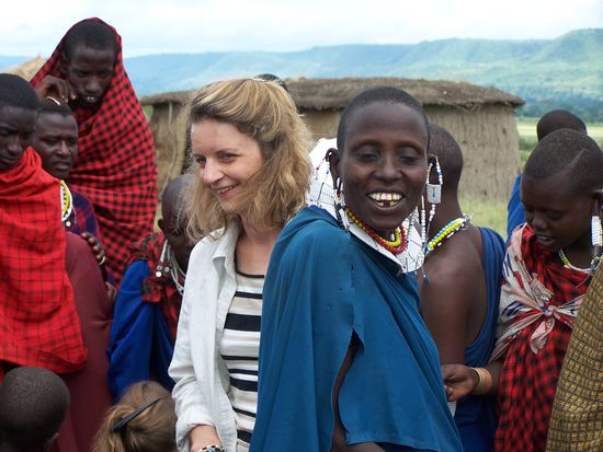Die Massai-Frauen boten wunderschönen Schmuck zum Verkauf an. Und wir Mädels waren durchaus interessiert, ein paar schöne Armbänder, Ketten usw. zu kaufen. Unser Führer übersetzte unsere Verhandlungsversuche. Da er aber vollauf beschäftigt war mit anderen Reiseteilnehmern, habe ich es mal allein versucht. Schon schwierig, Preise auszuhandeln, wenn man die Sprache nicht beherrscht ! Ich wußte nicht, ob es Sinn macht, Zahlen mit einem Stock in den Staub zu schreiben, denn die meisten Massai dürften Analphabeten sein, also bediente ich mich meiner Finger und hoffte, daß die Damen ebenso wie ich in Tanzania Shilling kalkulierten und nicht etwa in US-Dollar ! Aber kein Problem, die Worte Shilling und Dollar waren selbstverständlich geläufig und wir verhandelten auf Shilling-Basis. Meine "Ausbeute" waren ein unheimlich schöner Halsschmuck, sowie mehrere Armbändchen. Der Preis schien mir okay, aber leider hatte ich es nicht passend. Wechselgeld wurde auch schnell hervorgezaubert - und oh Wunder: Ich erhielt mein Wechselgeld in USD ! Nach einer Weile verließen wir das Dorf und fuhren zu einer Dorfschule, wo uns die Rektorin begrüßte und uns herumführte. Innerhalb von Sekunden waren wir umzingelt von lauter Kindern, die zwar irgendwie schüchtern waren, aber die Neugier siegte und jeder faßte uns spontan bei den Händen. Mzungu ! Das war das Wort der Stunde - Weiße ! Es kam der Gedanke auf: Schnapp`dir einfach irgendeine dieser süßen Rotznasen und nimm sie mit, das fällt niemandem auf... Was natürlich totaler Quatsch ist. Aber man gerät in Versuchung, ganz ehrlich !