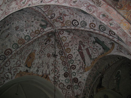 Auch die Kirche aus dem 12. Jahrhundert von Österselö können wir trockenen Fußes umrunden. Die Deckenmalereien stammen aus dem 15. Jh.