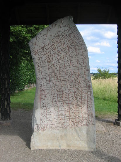 An der Kirche von Rök steht ein riesiger Runenstein.