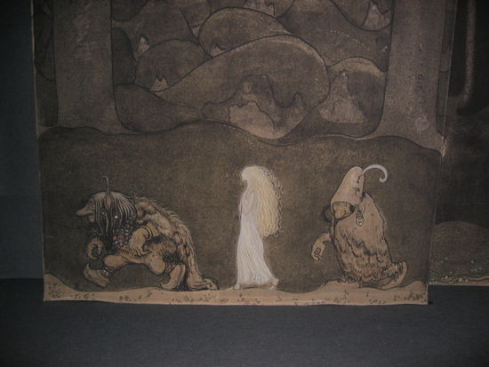 "Die Trolls von John Bauer können winzige Insekten unter hölzerner Wurzel oder gewaltige Bergwesen sein, sind aber doch zumeist von menschlicher Statur. Mit ihren großen Nasen, spitzen Ohren und langen behaarten Armen sehen sie wie aus der Natur gewachsen aus". (aus der URL des Museums)