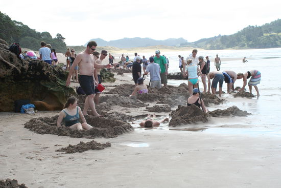 Wir haben die Grossstadt hinter unter uns gelassen und auf Kurven und Schotterreichen Strasse bei Sonnenschein die wunderschoene Halbinsel Coromandel hinter uns gelassen. Heute haben wir am Hot Water Beach in selbst gebuddelten Badewannen geplanscht und uns dabei den Pelz verbrandt.