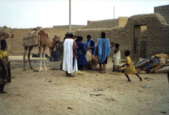Steinsalz aus Taoudeni (in der Wüste des Nordens von Mali) auf dem Markt in Koutiala. Es wird vor allem gern für die Tiere verwendet, da diese das Salz brauchen. Aber auch der Mensch konsumiert es, es ist sehr gesund, da es noch viele andere Mineralien enthält, auch wenn es hier eher leicht verschmutzt wirkt. Es wird wie oben erzählt in den Minen von Taoudeni abgebaut, mit den Kamelen in der Regel als Salzplatten mit der Azalaï Karawane nach Timbuktu gebracht und von dort mit Booten nach Mopti verschifft, wo es weiter im Land verteilt wird. Das Foto unten rechts stammt vom Dez. 2000 und ist aus Timbuktu, wo gerade eine Salzkarawane aus Taou-deni angekommen ist und im Quartier Abaradjou (auch Abarass genannt) entladen wird. Die Kamele haben eine lange und gnadenlos harte Reise hinter sich und sind "glücklich", wieder zu Hause zu sein. Ich habe mir eingebildet, sie würde lächeln... was sicher zu einem gewissen Grad berechtigt war. Die Tiere kennen den Weg genau, weil sie instinktiv wissen, wo es Wasser hat (und Futter), also müssen sie nach der tage-langen Entbehrung ja glücklich sein, sie wissen genau "hier hat es Wasser und Futter". Doch dies nur schnell zur Erklärung, jetzt geht es wieder zurück zu den Märkten!