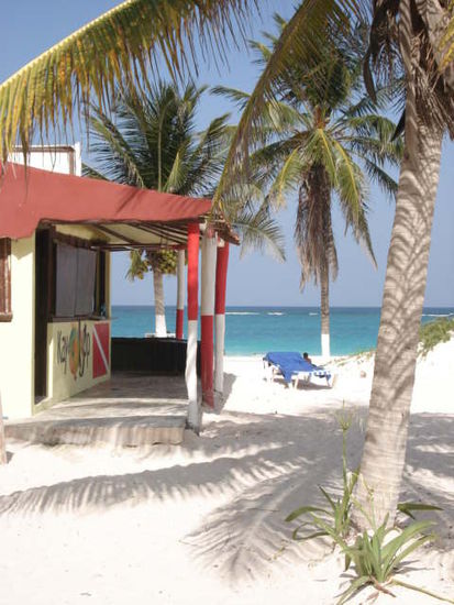 Nach unserer Ankunft in Tulum nahmen wir mit den anderen 3 Touristen (Papa mit 2 Kindern aus Frankreich) ein Taxi ans Meer. Der Taxifahrer liess nicht mit sich handeln. Ich hatte ja gelesen, dass in Tulum hohe Fixpreise vorherrschen...aber probieren kann man's ja trotzdem. Nur nuetzte hier kein freundlicher Augenaufschlag und ich musste mich geschlagen geben. (was nicht etwa heisst, dass ich aufgeben werde...ihr werdet schon noch "sehen";-D)