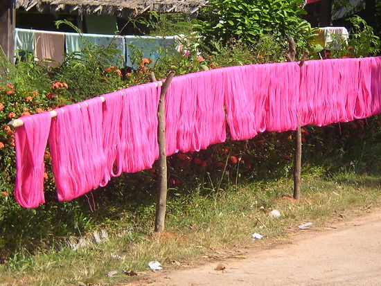 Das ist das Ausgangsmaterial. Jede Menge Baumwollfaeden. Die pinkfarbenen kommen gerade aus dem Farbtopf, der uebrigends nur Rinden, Blueten oder andere pflanzliche Stoffe enthaelt, und haengen da zum trocknen.