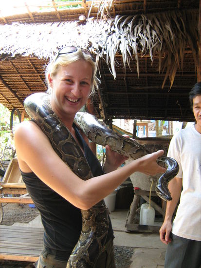 Jeder der mich kennt, weiss das ich keine Angst vor Spinnen, Schlangen oder sonstigen Getiere habe. Daher ließ ich mir auch sofort die Riesenschlange um den Hals legen.