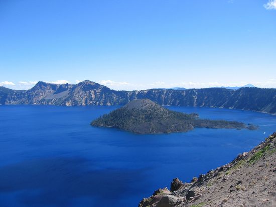 Crater Lake ist der groesste Suesswassersee der Welt, der nur von Regenwasser (ohne Zu- oder Ablauf) gespeisst wird. Das Wasser ist ganzjaehrig immer um die 2 Grad kalt, weshalb wir dann doch auf ein Bad verzichtet haben