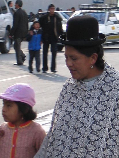 Ach ja, etwas lustiges gibt es auch noch: Die indigenen Frauen hier in La Paz tragen "Melonen" als Huete! Als vor ca. 100 Jahren ein englischer Geschaeftsmann auf seinen importierten englischen Maennerhueten sitzenblieb, weil die bolivianischen Maenner sie nicht tragen wollten, kam er auf die Idee, sie den Damen der Oberschicht als letzten Schrei der "Haute Couture" aus Europa zu verkaufen. Er hat sich damit wirklich durchgesetzt und seither werden sie hier von vielen indigenen Frauen getragen. Eine Bedeutung haben sie auch: Tragen die Damen den Hut senkrecht, dann sind sie verheiratet! Tragen sie ihn schief, dann sind sie noch zu haben! Bleibt nur zu hoffen, dass nie der Wind ein gerade getragenes verrutscht, bevor man eine Dame anspricht!