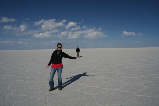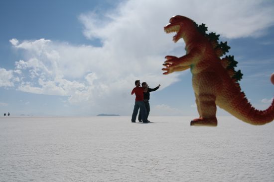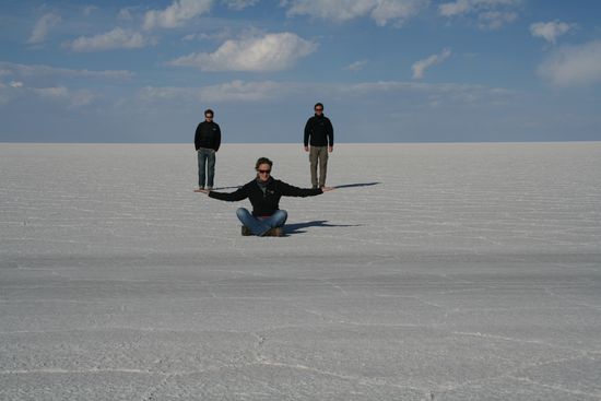 Auf dem Salar kann man durch die komplett weisse Oberflaeche (wehe dem, der keine Sonnenbrille dabei hat) ziemlich lustige Bilder machen. Mark und Owen hatten fuer unterstuetzendes Equipment gesorgt und was dabei rauskam... Seht selbst: