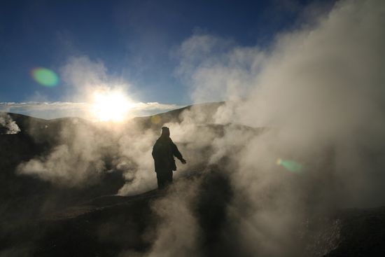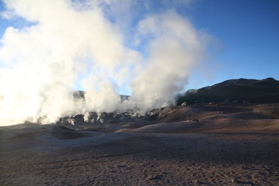 Nur Morgens bei Sonnenaufgang speien die Geysiere von Tatio Ihren Dampf in die Luft, nachdem sie die gefrorene Oberflaeche mit Hilfe der Sonne durchbrochen haben. Danach ist es fuer den Rest des Tages nur noch ein brodelndes Feld!