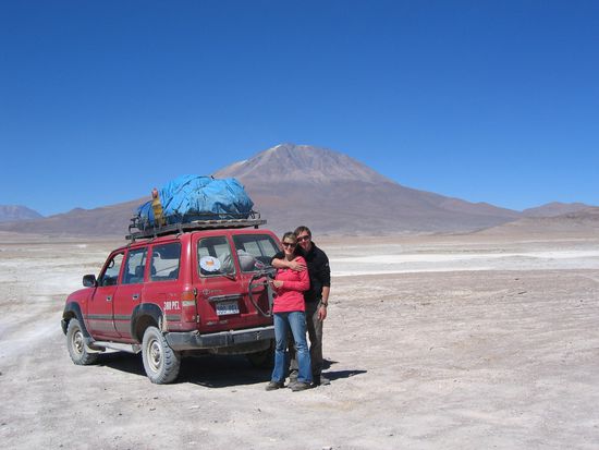 Und Morgens um 4:30 Uhr wurden wir dann bei Eiseskaelte rausgeschmissen. Ohne Fruehstueck, aber mit der Erwartung, dass wir den aktiven Geysiren von Tatio waehrend des Sonnenaufgangs zuschauen koennen, haben wir uns in Rekordzeit angezogen (wobei viele sich Abends nicht mal ausgezogen hatten sondern gleich so in den Schlafsack gehuepft sind) und in den voellig vereisten Jeep gesetzt. Brrrrrrrrrrrrr! Und auf den ersten Metern musste Renato auch noch den Kopf aus dem Seitenfenster strecken, weil die Frontscheibe noch komplett vereist war. Das war vielleicht saukalt!!!