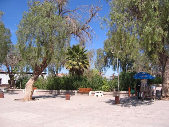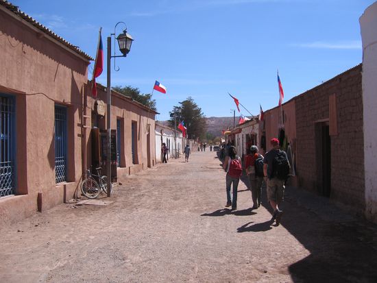 Von der chilenischen durften wir kein Foto machen. Auch die Einreise dauerte fast eine Stunde und zum erstenmal wurden auch all unsere Rucksaecke durchsucht - von der Desinfektionsmatte reden wir gar nicht. Chile ist halt irgendwie..."ordentlicher"?! San Pedro de Atacama fiel dann erstmal durch eine um 20 Grad hoehere Temperatur angenehm auf...und die Shorts wurden ausgepackt!