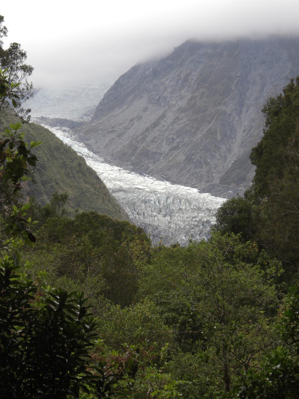 Leider war das Wetter am Franz-Josefs-Gletscher wirklich mies und alle Fluege mit dem Helikopter auf unbestimmte Zeit abgesagt. Wir haben deshalb nach einem halbstuendigen Hike an den Fuss des Gletschers beschlossen, unser Glueck anderntags am Foxgletscher zu versuchen. Der liegt zwar nur 22 km weiter, aber auf der wetterabgewandten Seite.