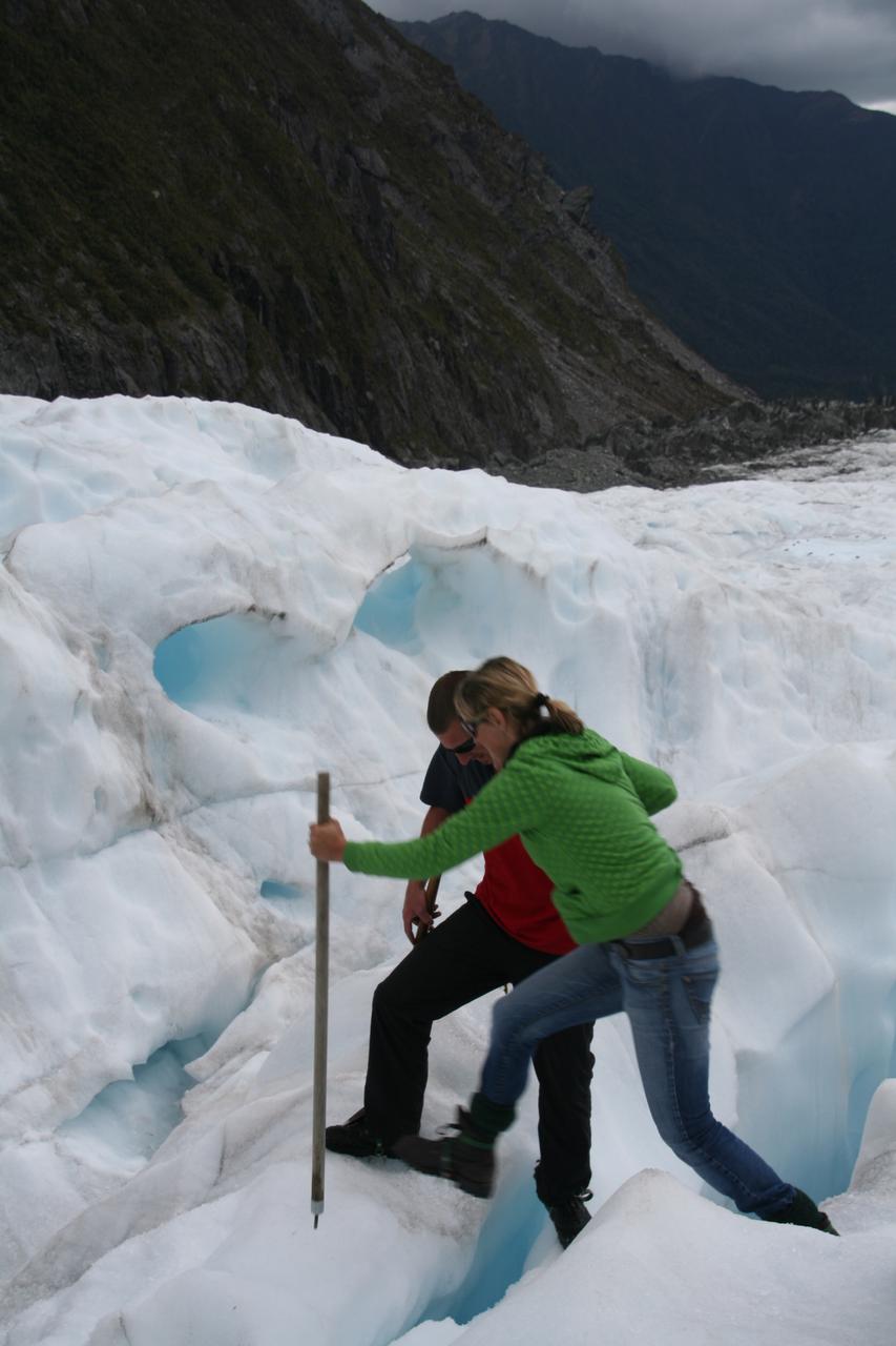 Unser Guide war ein ziemlich lustiger (was auch sonst...) Neuseelaender und die Besonderheiten des Gletscherhikings hat er ziemlich locker ruebergebracht. Lustig war mal wieder, wie sehr die Neuseelaender ueber Ihre grossen Nachbarn, die Aussis frotzeln. Opfer hatte er in unserer Gruppe auch gefunden und wir waren froh, dass wir als Deutsche hier ausserhalb der Schusslinie standen. Die Aussis allerdings waren auch nicht von gestern und so hat der verbale Schlagabtausch allen anderen dann auch viel zu lachen gegeben
