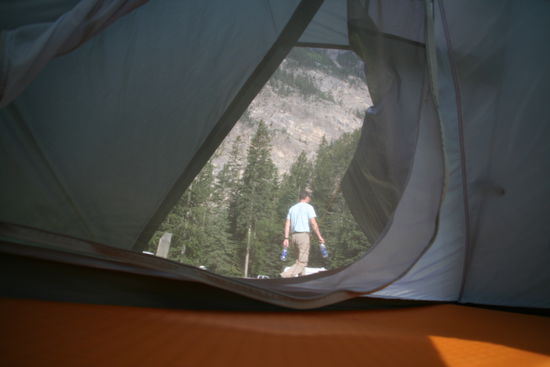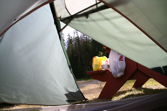 Nach 6 Stunden waren wir beide ziemlich abekaempft und gluecklich, wieder im Auto zu sitzen. Der letzte freie und dann auch noch schoene Campsite am Kicking Horse River im Yoho National Park hat den tollen Tag dann noch komplett gemacht.