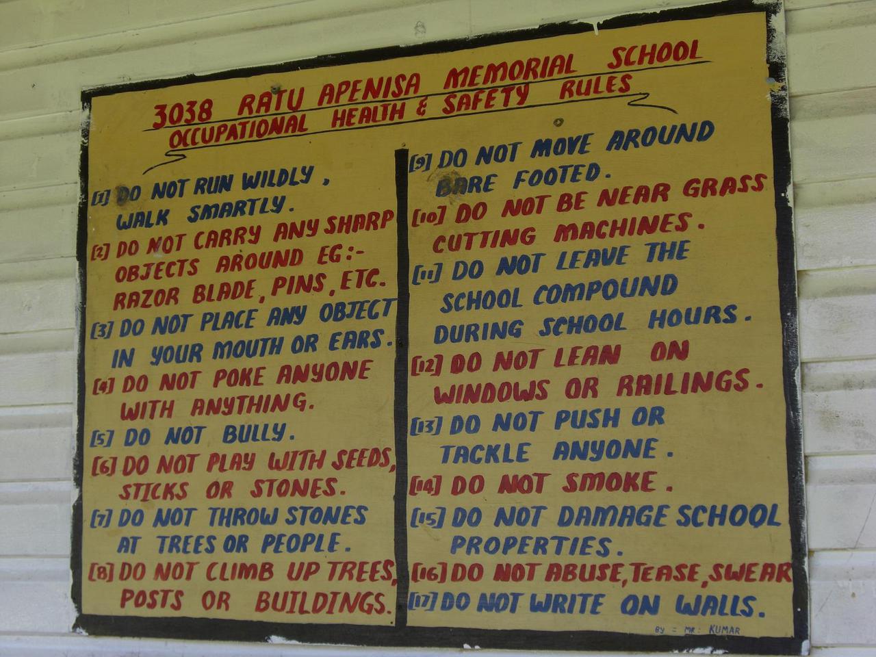 Der zweite Punkt der Reminder muss erklaert werden: In Fidji ist aerztliche Versorgung teuer, der Zahnarzt muss extra auf die Inseln kommen. Deshalb der allmittaegliche "Tooth brush Drill"