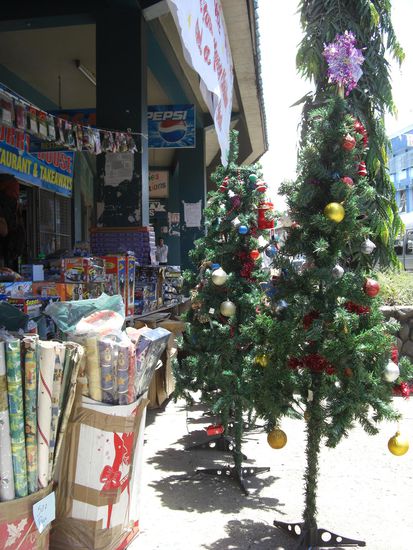 ... gibt es noch eine sehr geschaeftige Hauptstrasse. Lustig hier auch wieder die vielen Laeden mit Weihnachtsdeko, was uns - wie in Neuseeland - immer noch befremdlich vorkommt. Weihnachten so ganz ohne Kaelte...