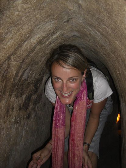 Auch wenn wir auf den Fotos lustig lachen, nach nur 40m in dieser schwuelen Enge bekommen auch wir ein Gefuehl dafuer, wie beklemmend das gewesen sein muss, wenn man teilweise monatelang am Stueck hier unten leben musste. Wenn wir uns dann noch vorstellen, dass scharfe Schaeferhunde hier heruntergejagt, Rauch, Napalm oder Wasser seitens der Amerikaner hier runtergeschuettet wurden, um die Partisanen auszuraeuchern... Wir wollten das wohl nicht erlebt haben!