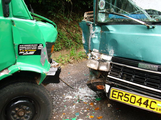 Wir hatten ein trotro nach Akosombo genommen, und da das trotro gut 20 Jahre auf dem Buckel hatte kam es mit der ein oder anderen Steigung nicht ganz so gut zurecht. Als dann einige Schilder eine starke Steigung ankuendigten schaute jeder gespannt, wie der Fahrer das jetzt managen will. Er tat folgendes: Vor dem Anstieg gab er Gas wie ein Bekloppter, vor der Steigung kam dann noch eine Rechtskurve, wo er aber nicht abbremsen wollte, weil er den Schwung fuer den Anstieg brauchte, also bremste er halt nicht, kam dann natuerlich auf die linke Fahrspur, was auch nicht ungewoehnlich war, die hat er waehrend der Fahrt schon des oefteren benutzt, nur Gegenverkehr damit konnte ja keiner rechnen... Das andere Trotro war kleiner als unseres, deswegen hat es dort die Beifahrerkabiene ziehmlich ramponiert, und der dort sitzende Passagier hat sich an den Scherben die Hand etwas aufgeschnitten, aber sonst gab es keine Verletzungen. Und was machen echte Touris in so einer Situation? Sie rennen um die beiden Autos rum und machen Fotos, die Ghanaer muessen uns fuer total bescheuert gehalten haben, aber musste sein...