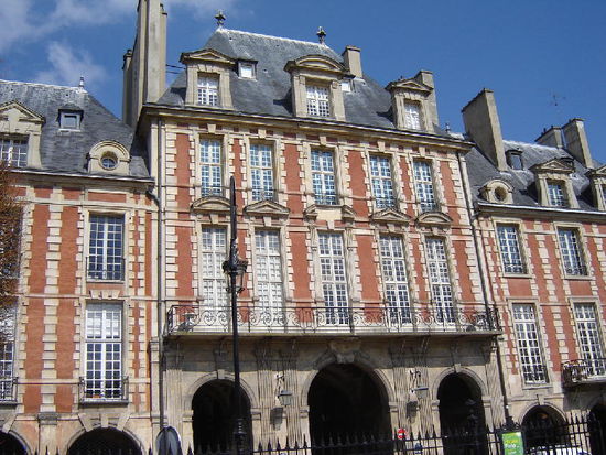 Place des Vosges; 1612 wurde der Platz eingeweiht. Da es Anfang des 17. JH. in Paris keinen andern Platz für grosse Feste und Aufzüge gab, entwickelte sich der Platz, gestaltet durch den König Henri IV. persönlich, bald zum Treffpunkt der eleganten Welt.