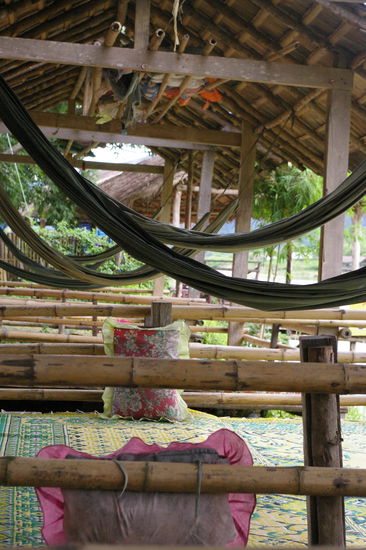 Ueber eine selbstgebastelte Holzbruecke erreichten wir die dort gelegenen Bars. Inmitten eines Bambushains direkt am Fluss lagen Holzpodeste, die mit Matten, etlichen Kissen und Haengematten ausgestatten waren. Nach ein paar Cocktails ging es voellig entspannt zurueck, um das kleine Doerfchen zu erkunden.
