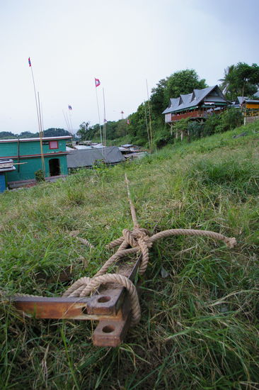 Gegen 8.00 Uhr morgends befanden wir uns am Anlegesteg des Bootes, fuer welches wir eine Fahrkarte gezogen hatten um ein letztes Mal ueber den Mekong die Ueberfahrt nach Thailand anzutreten. Ein ca. 30 M langes etwas!, veraltetes Holzboot, das sanft wiegend im Mekong lag, schien schon sehnsuechtig auf uns zu warten. Ganz im Gegensatz zu uns!