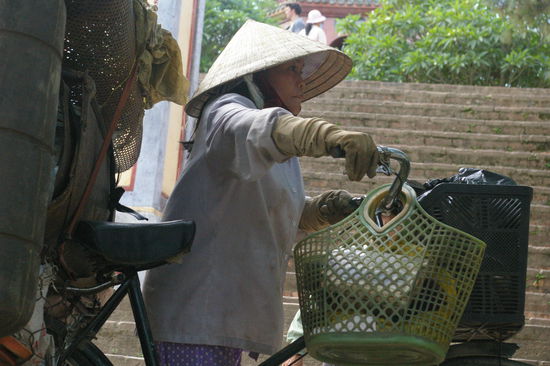 Nachdem wir die Stadtgrenze von Hue erreichten stieg als erstes mal ein frisch geschnickelter Verkaeufer, immer erkennbar an der goldenen Uhr, einer sauberen Hose, ein gebuegeltes Hemd und einem frischen Haarschnitt, zu uns in den Bus und erklaerte uns er sei die touristische Informationstelle hier in Hue.