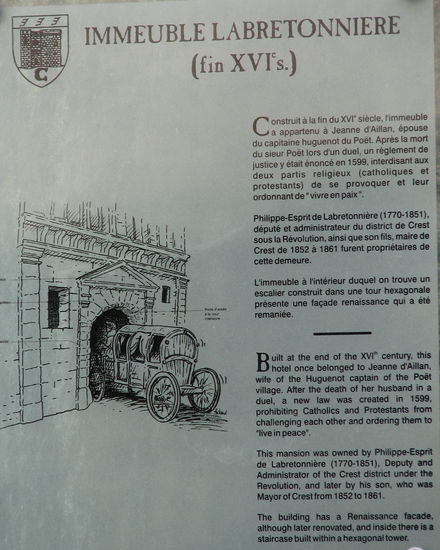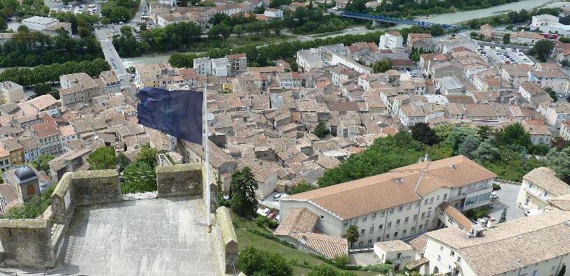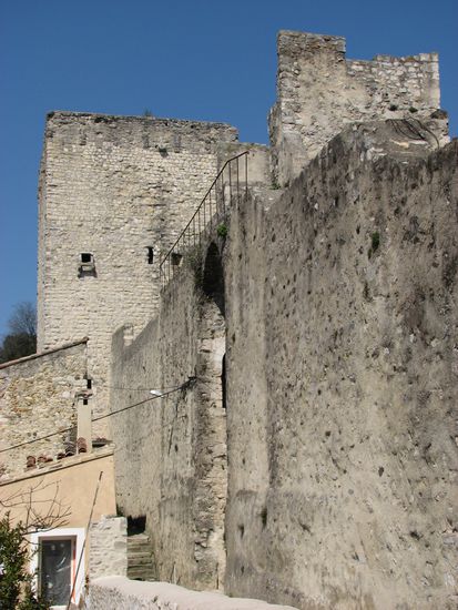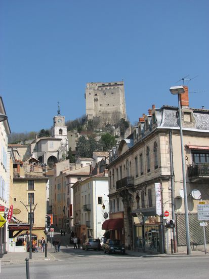 Hoch oben auf dem Felssporn steht die nur aus einem Turm bestehende Burg Crest. Dieser ist aber mit 52 Meter Höhe der höchste Burgturm in Frankreich.