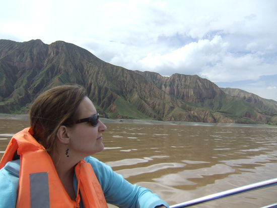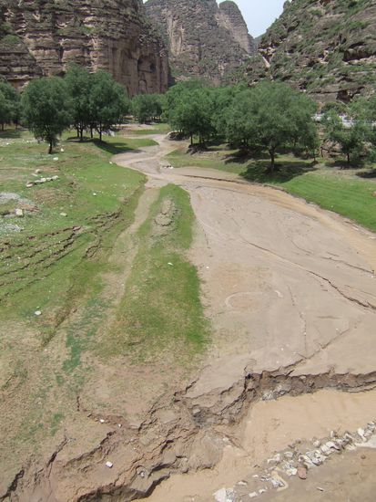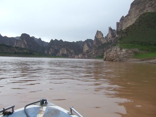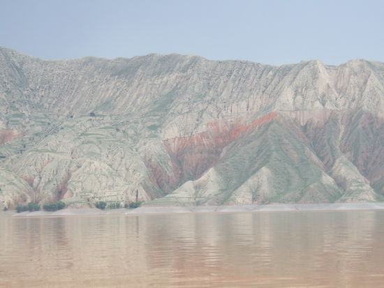 Der Gelbe Fluss hat seinen Namen dem vielen Loess, den er mit sich fuehrt, zu verdanken. Einerseits bringt der Loess der Landwirtschaft an den Ufern des Flusses fruchtbare Boeden, andererseits verursacht er durch die Erosion und die viele Fracht, die er mit sich fuehrt gewaltige Schaeden. Anscheinend sollen Stauseen z.B. infolge der grossen Ablagerungen von kurzer Lebensdauer sein. Auf folgenden Fotos kann man die Zweifaerbung des Sees recht gut erkennen.