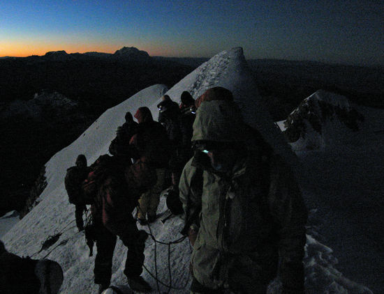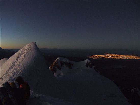 Anfangs queren wir den Gletscher und gehen auf geringer Steigung durch die Dunkelheit. Nach ca. einer Stunde wird unser Weg immer steiler und unsere Schritte immer langsamer. Zehen und Finger sind eiskalt und nur durch staendiges Bewegen bleiben sie einigermassen durchblutet. Lorenzo fuehrt uns ueber einen steilen Hang direkt ueber eine Eisspalte mit einem schmalen Steg und goennt uns eine erste Pause. Das mitgefuehrte Wasser ist bereits ziemlich kalt und ich bin froh um meine Thermosflasche, die ich mir noch am Tag davor ausgeliehen hab...das Wasser in Johns Plastikflasche ist gefroren! In der Ferne sehen wir die Lichter von El Alto ueber dem Tal von La Paz.