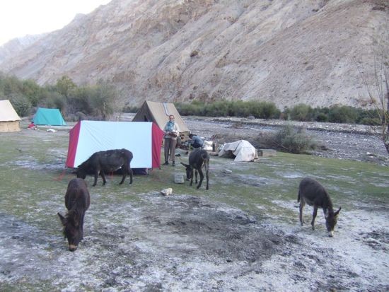 Ankunft am Camp schaut so aus: Die Pferde werden abgesattelt, das Kochzelt wird aufgebaut, wir bauen unser Zelt auf und machen es uns gemuetlich bis 10min spaeter Lakba (unser Koch) vor unserem Zelt "Tea,tea" ruft...