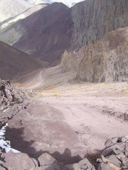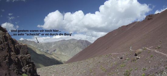 Da Fred unmittelbar nach der Markha Valley Tour den Stok Kangri besteigen will, weicht unsere Tour ab hier von dem ueblichen 8-Tages-Markha-Valley-Trek ab: wir muessen ueber einen weiteren Pass, den Stok La. Vom Camp ist der Pass nicht weit dafuer aber ordentlich steil...