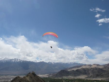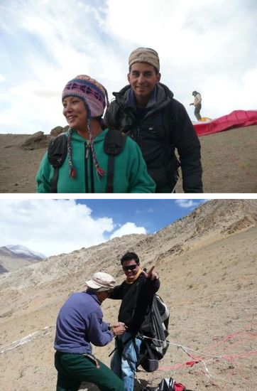 ....es ist auch ein super Startpunkt zum Paragliden. Hier sieht man Alexis und Gaille mit ihrem Schirm ueber Leh!