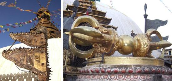 Die Ausrichtung der "Buddha Eyes" in jede Himmelsrichtung symbolisiert seine Allwissenheit und Allgegenwaertigkeit. Das Zeichen, dass die Nase darstellt, ist die Nummer 1 in nepalesischer Schrift, was fuer die Einheit aller Dinge stehen soll und fuer den EINEN Weg, der zur Erleuchtung fuehrt. Ueber den Augen ist ein drittes Auge angeordnet, das die Allweisheit Buddhas darstellen soll.