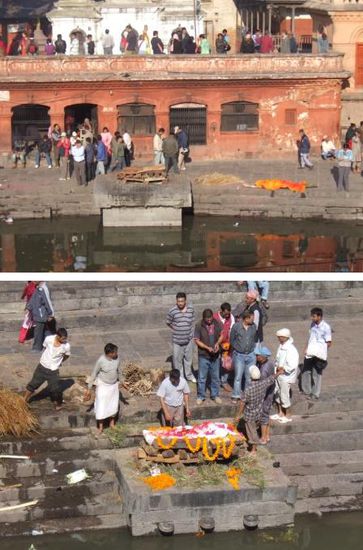 Der Koerper wird auf einen Holzhaufen gelegt, Blumen werden mit auf den Weg gegeben und nachdem der Leichnam fuenf mal vom aeltesten Sohn des Verstorbenen umrundet wurde, wird das Feuer, am Mund beginnend, entfacht. Nach ca. vier Stunden bleibt nichts als Asche zurueck und diese wird in den Fluss geleert und driftet Richtung Indien in den Ganges.