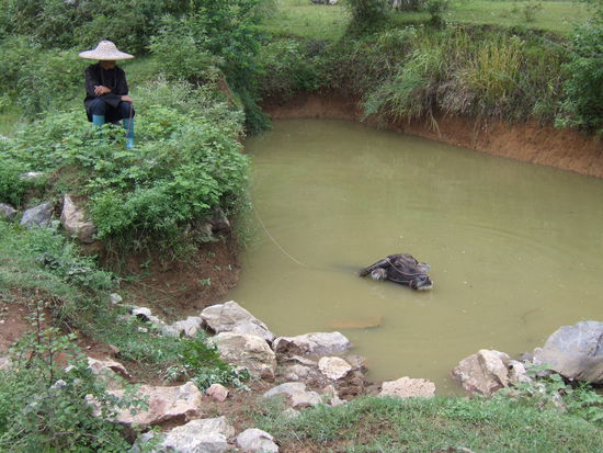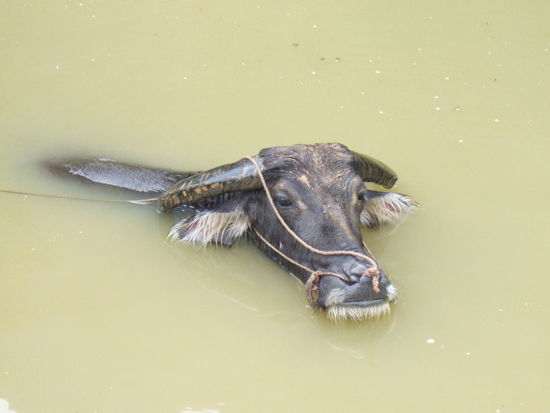 Am Wegesrand hat einer der Bauern seinem Wasserbueffel ein Bad gegoennt.
