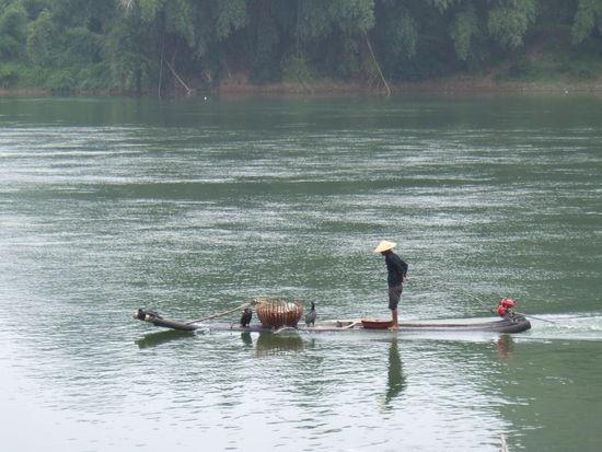 Einmal ist ein Cormoran-Fischer an uns vorbeigekommen. Die Cormorane uebernehmen das Fischen und werden durch eine Schlinge um den Hals daran gehindert, die Fische zu verschlucken. Als Lohn gibt es hin und wieder einen Fisch den sie verspeisen duerfen. Leider ist diese Art des Fischens hier zu einer Touristenattraktion verkommen und es gibt jeden Abend eine Vorfuehrung der Fischer.