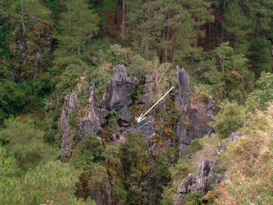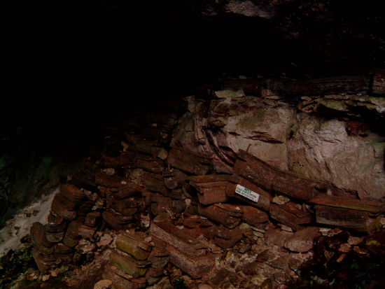 Nicht wenig staunen wir, als wir sie mit eigenen Augen sehen - die an den bizarren Felsen an Seilen hängenden Särge. Die "Igorot" bestatten seit Jahrhunderten ihre Toten in großen Begräbnishöhlen oder an Felswänden. Eine solche Bestattung fand zuletzt 2006 statt. Zu einer der Begräbnishöhlen, die nicht allzu weit vom Ort entfernt war, ließen wir uns fahren. Zu Fuß immer am Hang entlang ging es weit ins Tal hinunter zur "Lumiang Cave". In dem großen Höhleneingang konnten wir hunderte von Särgen übereinander gestapelt sehen. Dies ist nicht die einzige derartige Höhle, es gibt noch weitere die man teilweise mit Gittern versehen musste, weil übereifrige Touristen der Meinung waren, alles mitnehmen zu können.